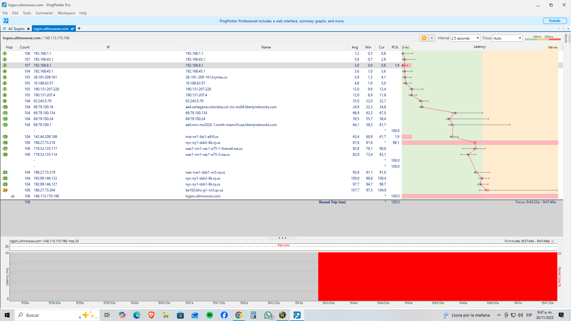 Hola @chetuam, La única anomalía que se aprecia es una pérdida del 91% de paquetes en el salto 16. Ese salto pertenece a la empresa que nos aloja y está relacionado con el incidente reportado aquí: En cuanto al resto de saltos que muestran un 100% de pérdida, no es realmente así. Simplemente tienen el eco entrante cerrado y no responden a ese tipo de solicitudes. Como mencionamos en otros hilos, desde el inicio del problema estamos proporcionando datos a la empresa responsable para resolver la situación lo antes posible. No se trata de un problema de UltimoWoW, sino de la empresa proveedora y de los carriers con los que trabaja. Como medida provisional, recomendamos utilizar Cloudflare WARP, ya que en muchos casos fuerza rutas alternativas que evitan los PoPs degradados: https://developers.cloudflare.com/cloudflare-one/team-and-resources/devices/warp/download-warp/ Saludos. -