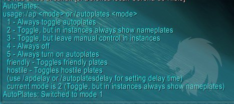 AutoPlates es un addon diseñado para activar automáticamente las Placas de Nombre al entrar en combate, y desactivarlas automáticamente al finalizar el combate.