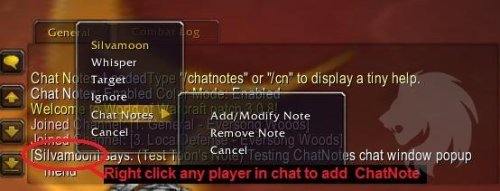 Simplemente haz clic con el botón derecho en el nombre de un personaje en la ventana de Chat para que aparezca el menú Chat Notes, donde puedes Añadir/Modificar, o Eliminar una nota.