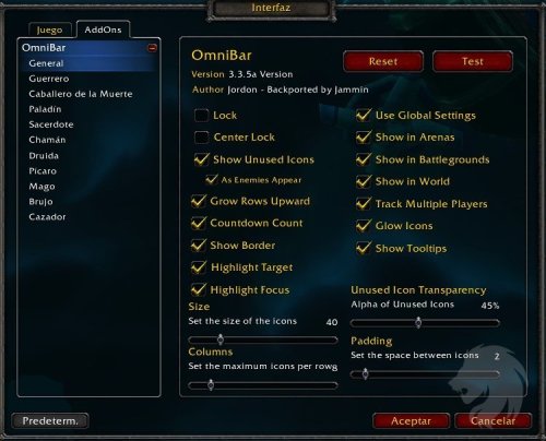 - Visibilidad: Elige si quieres mostrar OmniBar en arenas, campos de batalla y combates mundiales.