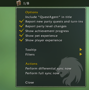 En lugar de solo darte breves actualizaciones sobre las misiones en las que está tu grupo, QuestAgent te muestra el registro completo de misiones de otros miembros del grupo, ¡como si tú tuvieras las misiones! Además, QuestAgent se integra completamente con LightHeaded si lo tienes instalado.