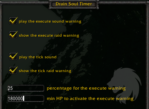Drain Soul Timer es un addon simple pero efectivo que proporciona una advertencia visual y/o reproduce un sonido cuando "Drenar alma" hace efecto y cuando la salud del objetivo está en el rango de ejecución.