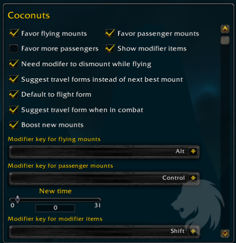 - options favorFlying: Alterna si se deben preferir monturas voladoras si estás en un área que lo permite (por defecto: sí).