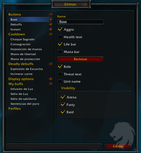 - Barra personalizable: añade un jugador a esta barra con /chinon add (remueve con /chinon remove) o añade la mascota de un jugador con /chinon addpet (remueve con /chinon removepet): útil para Razuvious