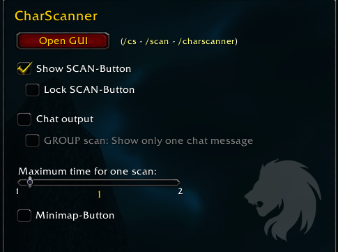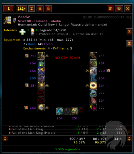 CharScanner escanea datos básicos del personaje, especialización de talentos, equipo, logros de PvE/PvP, estadísticas de asesinatos de jefes de PvE y estadísticas de PvP de un objetivo único o de un grupo.