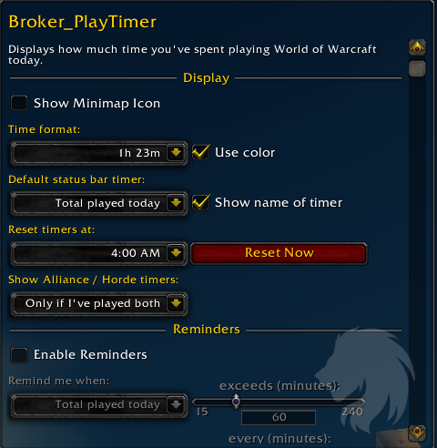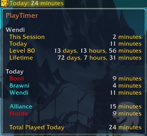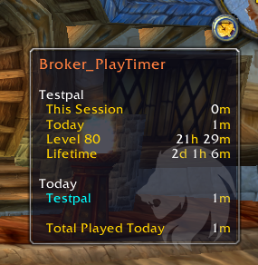 Broker_PlayTimer incluye temporizadores para el personaje actual (sesión, hoy, nivel y de por vida), temporizadores diarios para todos los personajes en la cuenta, tiempo jugado hoy como Alianza o Horda, y el total jugado hoy.