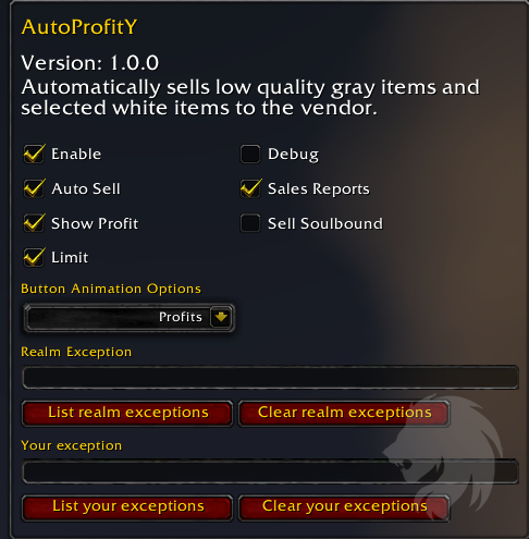 Vende automáticamente los objetos de baja calidad (grises) y los objetos blancos seleccionados al vendedor.