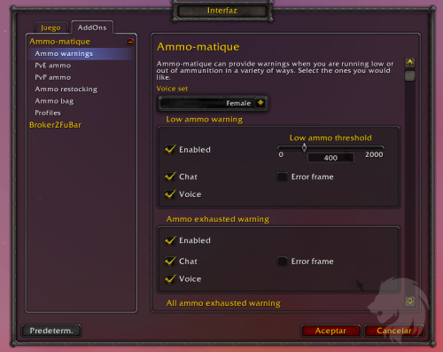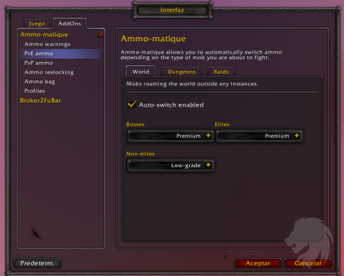 - Soporte para AddonLoader, haciendo que Ammo-matique solo se cargue en personajes que usan munición (cazadores, guerreros y pícaros).
