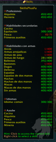 El menú de FuBar mostrará ya sea habilidades o el nombre de una habilidad que puede usarse para crear cosas (por ejemplo, Minería no se muestra, pero Fundición sí).