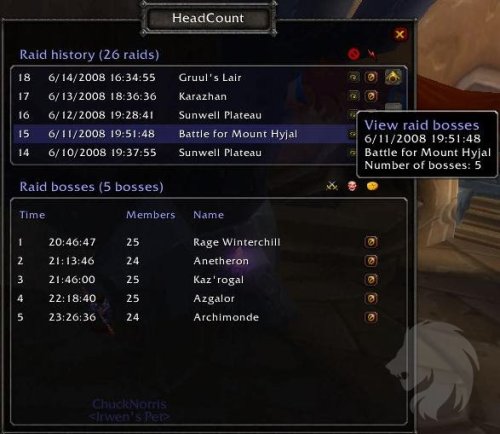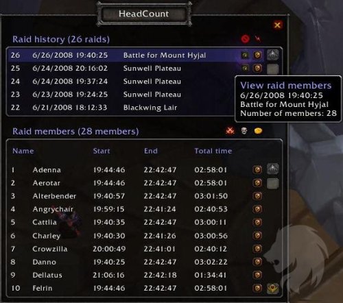 HeadCount es un addon configurable que registra automáticamente la asistencia a las bandas, el botín y las muertes de jefes.