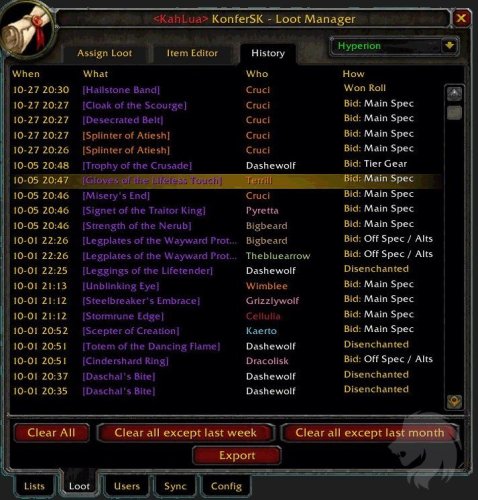 Hay cosas que puedes hacer para facilitarte la vida a la hora de distribuir el botín. En primer lugar, si tienes varias listas para que la gente tire dados y sueles empezar con una en particular, establece la lista por defecto en la ventana de configuración del botín (/ksk config). Segundo, si se trata de una configuración de hermandad y vuestros rangos están sanamente asignados y utilizáis el filtrado de rangos, estableced el rango por defecto con el que queréis empezar a pujar en la configuración de cada lista. Tercero, marca correctamente a los usuarios que son encantadores en el editor de usuarios.