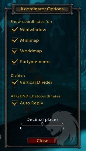 Koordinator es un addon que añade un sistema de coordenadas al mapa del mundo, al mini-mapa, a los retratos de los miembros del grupo y a una mini-ventana separada que se puede arrastrar.