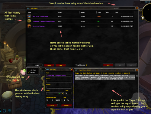 Siempre es una buena práctica mantener un registro del botín, es por eso que se ha añadido esta función también. Guardará el historial de botín por personaje, pero puedes acceder a los de cualquier personaje que quieras (aunque con la misma cuenta).