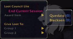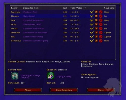 Loot Council es un nuevo addon diseñado para ayudar a los consejeros de botín con una sólida interfaz de votación. Cada vez que un asistente de banda o un líder de hermandad inicia una sesión de consejo de botín para un ítem específico, los miembros pueden susurrar su ítem actual al iniciador, enlazarlo en el chat de oficiales, enlazarlo en el chat de hermandad o enlazarlo en el chat de banda. El addon procesará el ítem y lo mostrará en una tabla fácil de usar. Los oficiales podrán votar a favor o en contra de varios miembros y ver cómo han votado otros oficiales.