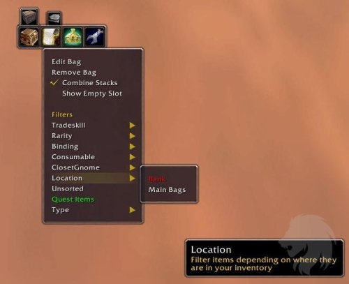 También puedes establecer un filtro para un ítem concreto cogiéndolo, manteniendo pulsada la tecla Shift y haciendo clic en la bolsa para la que quieras establecer el filtro. El color del título de la información sobre herramientas indicará la configuración del filtro. Los ajustes por ítem siempre prevalecerán sobre cualquier otro ajuste de filtro.