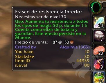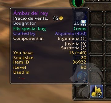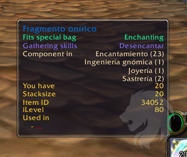 En el tooltip podrás ver información como la cantidad que tienes, itemID, ilevel, en qué profesiones se usa, para qué profesiones es componente, de qué profesión/npc sale y más.