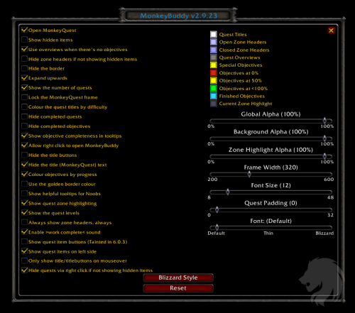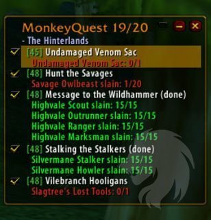El addon MonkeyQuest muestra las misiones y sus objetivos en un bonito marco que se puede arrastrar de forma muy personalizable.