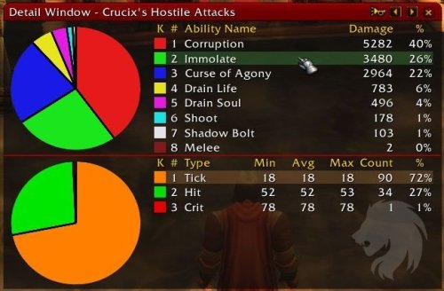 El addon visualiza la actividad en el registro de combate, y utiliza esa información para proporcionar tablas y gráficos que muestran el daño y la distribución de curación de un grupo o banda.