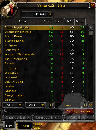 Además, registra las estadísticas PvP en PvP al aire libre y las muestra en el tooltip (configurable).