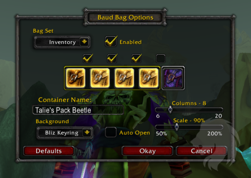 Completo con un menú gráfico fácil de usar para cambiar cómo se mostrarán tus bolsas. Usa los comandos de chat /baudbag o el botón de menú en cualquiera de las bolsas de BaudBag para cambiar la configuración.