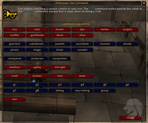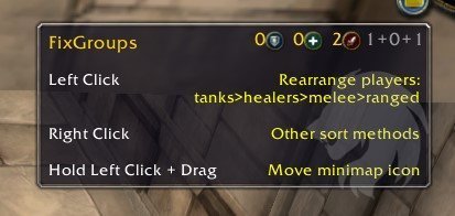 - Añade la composición del grupo a tu IU si estás usando un addon de Data Broker (Titan Panel, ChocolateBar, ElvUI, etc.) FixGroups hace que la composición esté disponible como un objeto Data Broker (también conocido como plugin LDB).