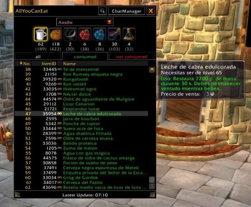 AllYouCanEat busca detalles sobre las siguientes estadísticas: alimentos, bebidas, elixires, pociones, vendas y frascos.