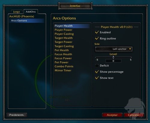 ArcHUD muestra arcos suaves alrededor de tu personaje en el centro de la pantalla para informarte sobre tu salud y poder (maná, rabia, ...), el de tu mascota y el de tu objetivo.