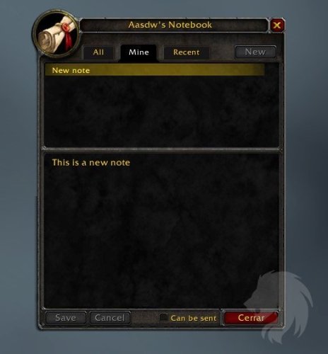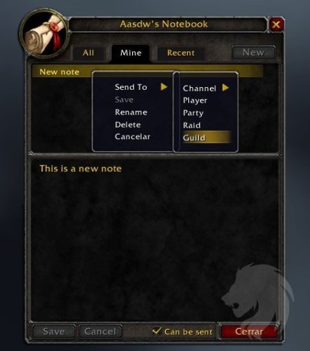 Notebook es un addon para guardar notas de texto en el juego, y para opcionalmente compartir o enviar estas notas con otros jugadores a través de susurro, banda, grupo, hermandad, o canal de chat.