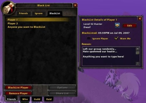 Esto es como Ignorar, excepto que una cantidad ilimitada de jugadores con descripciones editables, clase, raza, nivel, facción y razón detallada para ponerlos en la lista negra.