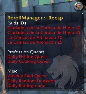RerollManager te ayuda a mantener una visión general de tus alts. Registra tus ids, profesión y misiones semanales, mazmorras y campos de batalla diarios y te muestra un resumen.