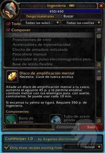 Crafthelper es un pequeño addon, que te permite filtrar recetas por dificultad. Puedes elegir entre dificultad trivial, fácil, media u óptima de las recetas.