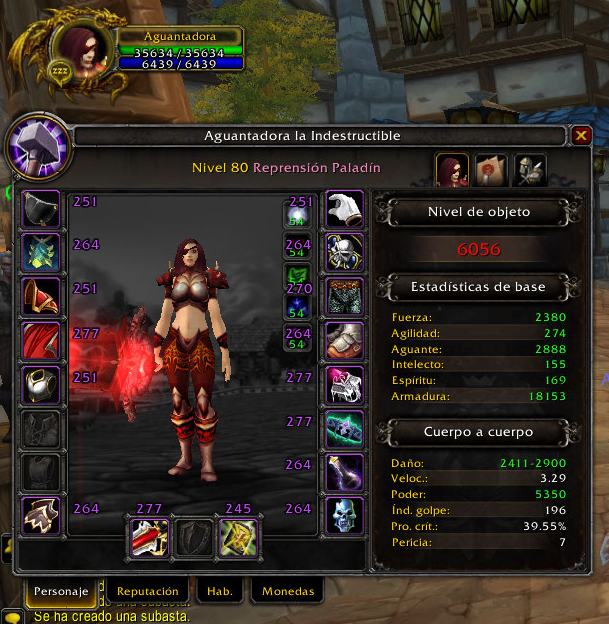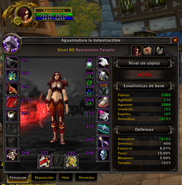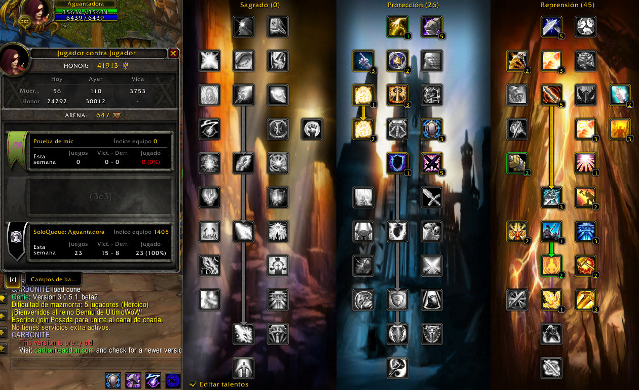 Buenos días, ayer realicé una guía en Youtube sobre el Paladín Reck, ya que la forma mas correcta de hacer comprender a los jugadores como funciona era directamente hablando sobre la build, asi que simplemente prendí directo y dije todo lo que hemos aprendido y aplicado en el Paladin Reck hasta el dia fecha, incluso hay unos pequeños ajustes en sus talentos, dejaré el enlace a la misma para aquel curioso que guste entender la Build al 100%, un saludo! Primero que nada la distribución definitiva de talentos es esta: Otra cosa mas que quisiera aclarar es lo siguiente, haré una explicación del daño que hace un Paladín Reck, digamos que en la mejor de las situaciones, osea un PvP que al instante de entrar en duelo se active expiación, lo haré explicando todo: El Paladin Reck es una build la cual aprovecha el talento de tanque Expiación, lo que hace este talento es dar 3 golpes fisicos extras con el arma, el Reck usa como arma principal la Bryntrol, Mediadora de hueso heroica, por que esta arma a pesar de no dar indice de golpe crítico que es lo que mas necesita el Paladín en PvP pues da algo mucho más interesante que es el drenar vida que dispone el arma que se activa probabilidad al golpear con la misma. Expiación en 5/5 de puntos tiene un 10% de activarse al recibir daño de cualquier origen, así como tambien si paras un ataque con tu arma tienes ese mismo 10% para activarse. Al activarse estando con Bryntrol lo que hace el Reck obviamente es Burstearse, si tienes ingeniería usa guantes celeridad para dar mas probabilidades al Swing Mele y de paso las Alas para +20% de daño Literalmente con expiación y tratado de Valentía que da 200 de fuerza siempre a parte que usas sello de venganza alianza o corrupción horda pues puedes buggear el drenar vida de la Bryntrol, dando mas ataques fisicos por drenado. Por que no tratado colérico de heleo, simple el tratado de Valentía da 200 de fuerza que junto al talento fuerza divina cada punto de fuerza equivale a 2.3 de poder de ataque, lo que significa que 200 de fuerza es 460 de poder de ataque y gracias al talento vaina de luz el 60% del poder de ataque se convierte en poder con hechizo, lo que significa que 460 de poder de ataque es 276 en poder con hechizo, osea heleo y daño sagrado, quería explicarte esto para que siempre uses tratado de Valentía. En fin gracias a Expiación y Bryntrol das literalmente 7 ataques físicos entre 8-13 segundos (varia por estadisticas, celeridad, encantamientos como guantes 340 cele o incluso en ocasiones la misma suerte o el talentos en si, si llega a brindar todos los ataques antes de terminar, recordar que no debes separarte del rival o no se daran los ataques extras, aun que se activa infinitamente mientras recibas daño, bloques o pares cualquier ataque ese 10% activara siempre que tengas el "PODER DE LA LUZ" o mas bien suerte de tu lado jajaja, mira lo positivo, expiación no tiene CD), lo que cada golpe da 4.5k de daño y obligado son unos mínimo 4 robar vida de 2.3 a 2.6k de daño, simplemente hagamos calculos: 4.5k x 7 = 31.5k de daño físico + el mínimo de robar vida que son 4 seria 2.5k (normal lo que drena la Bryntrol aun que puede drenar 2.6k de daño pero dejo 2.5k para que vean lo normal del drenar) 2.5k x 4 = 10k de daño. 31.5k + 10k = 41.5k de daño solamente DAÑO FÍSICO DEL ARMA Y EXPIACIÓN!! Osea que no conte el daño por golpe de cruzado, por sentencia, tampoco por exorcismo o por consagración, solamente DAÑO FÍSICO!!! Como exprese antes un usuario con 1000 de temple absorbe el 21% del daño lo que seria: El 21% de 41500 = 8715, asi que si 1000 de temple detiene 8.7k de daño al daño normal que mete físicamente un Paladín Reck con Expiación activado y Bryntrol mas su bursteo. Lo que significa que de 41.500 de daño un jugador con 1000 de temple absorbe 8.715, dando un total de: 32.785 de daño físico!!! Eso señores es la estrella del Paladín Reck, el inhumano daño que puede infligir de 1 momento a otro! Tengan en cuenta que estos calculos es en base a las estadísticas de mi personaje, las cuales son las siguientes: Vario mucho el uso de abalorios asi que no se alarmen por el sobrecapeo de golpe, es por el avanzado del apocalipsis, cuello y tarro, pero en ocasiones uso dual calaca o yunke, todo depende el rival obvio, cabe destacar que solo dispongo de piernas, cinto colerico, mi pecho, cabeza y manos son incansables, les explico eso por referencias en las estadísticas, mi temple asi es 935 y con cuello colérico y Yunke es 1079 (que es como normalmente le voy a los DK). En fin espero que les sirva se referencia y les de voluntad de utilizar y/o probar, experimentar con la build, total un cambio de talentos PvP solo cuesta 50 de oro, nada mas jajaja no creo sea un problema jajajaja Saluda atentamente: Aguantadora.