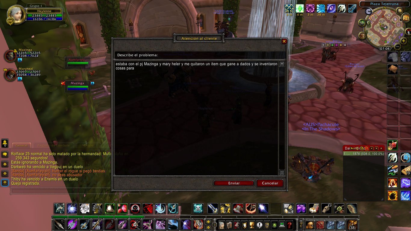 2. Llevo varios años en este server y la verdad nunca me había pasado aunque tengo varios colegas que se quejaron de esté hecho y para que cuestiones como esa no se repitan hoy vengo a denunciar la falta de respeto mas grande que es hacer que una persona pierda su tiempo en el día de hoy mientras entraba con un pj low a icc un icc irregular pues no tenía reglas de loteo unos avariciosos decidieron que era mejor darle a un amigo lo que gane por la suerte y así me quitaron un item que haría que mi ok mejorará y así me negaron la oportunidad de poder continuar con mi experiencia satisfactoria en el juego adjunto pruebas del hecho y espero que el maravilloso staff de esta gran familia llamada últimowow me dé una respuesta gracias por dejarme expresarme