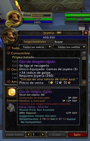 3. Hola Estimados Soy nuevo en joyería y no he revisado aun todas la gemas, pero encontré el siguiente detalle en una muy importante que necesitaba usar. El "Ojo de dragón rígido", indica dentro del juego que "Encaja en una ranura de color azul". Esto me llamo la atencion, ya que la joya es de color amarillo y debería encajar en una ranura de su mismo color para activar los bonus asociados. Al revisar en Wowhead, encuentro que efectivamente el texto in game es incorrecto, adjunto captura de mi partida y de lo que indica wowhead. https://www.wowhead.com/wotlk/es/item=42156/ojo-de-dragón-rígido Indico también todo el detalle de las gemas, en caso de que necesiten corroborar esta información https://www.wowhead.com/wotlk/es/items/gems?filter=99;11;0 Si no corresponde este tema en este apartado, y debo publicarlo en otro canal para que sea revisado por el equipo técnico. Agradecería que me lo indicaran. Saludos