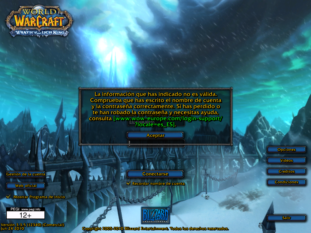 2. Buenas noches/tardes. Soy nuevo aqui, me cree una cuenta en Ultimo wow descargue el cliente version español españa. Hasta ahí todo bien. El problema surge que cuando abro el Wow no importa si puse los datos bien, me dice que mi información no es validad. Pero intento hacerlo desde aqui afuera y me abre normal la cuenta. El problema es al entrar al Wow como tal. Intenté crearme una ceunta alterna y tampoco funcionó. Ayuda!!! :c