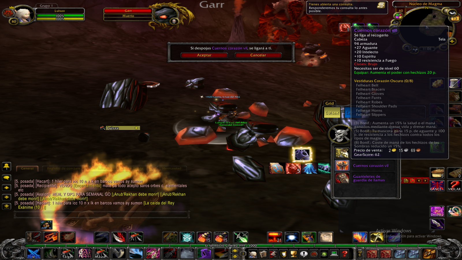 1. Personaje afectado: Luisax Motivo: Error al recojer el loot Modalidad: normal ID de Banda: 28346 Item(s): https://wotlk.ultimowow.com/?item=16808 Explicación: Entre a la banda a matar como cada semana a "Garr" para farmear este casco de transfiguracion el cual por fin cayo y le di need, pero sin darme cuenta deje grupo solo eramos 2personas y no habia rechazado la otra persona, y nos volvimos a dar party, al intentar recojer el loot y cambiarlo a las distintas formas de despojar no se pudo recojer el item, me quede mas de 30m intentando recojer, cayeron 3 objetos pero solo quisiera la ayuda con este en realidad.