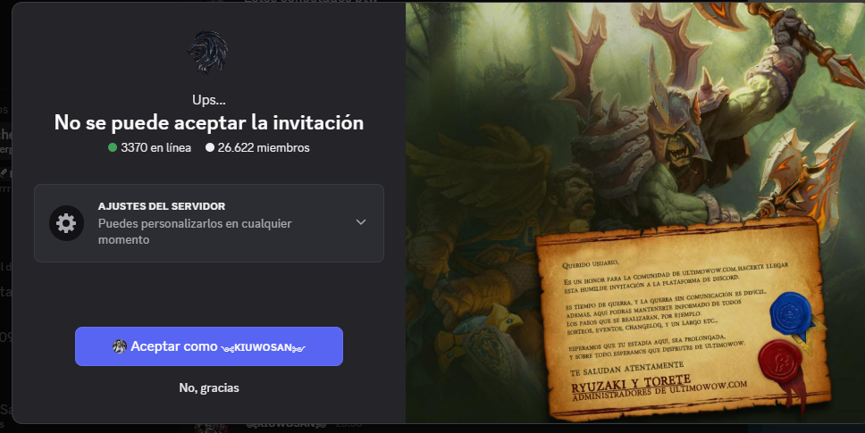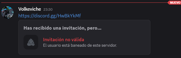 Buenas noches. Anteriormente jugaba en el servidor y estaba en el discord. Hasta que una vez me salí. Y ahora que volví a jugar, quise volver al discord como para estar pendiente de alguna noticia o algo y resulta que no me acepta la invitación. Pensé que era un bugg del discord así que le pedí a un amigo que me ayudase enviándome una invitación, y tampoco funcionó. A continuación dejo imágenes de lo que me salta cuando quiero intentar unirme: