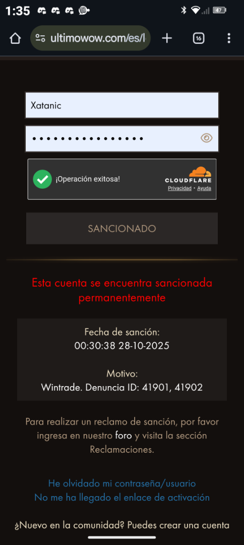 Solución Donmoncho Publicado Lunes a las 08:46 Solución Publicado Lunes a las 08:46 Hola @Xata para reclamar tú cuenta, debes ir a la sección de reclamos y hacer un post https://foro.ultimowow.com/forum/140-reclamaciones/ También puedes leer este post de como reclamar.